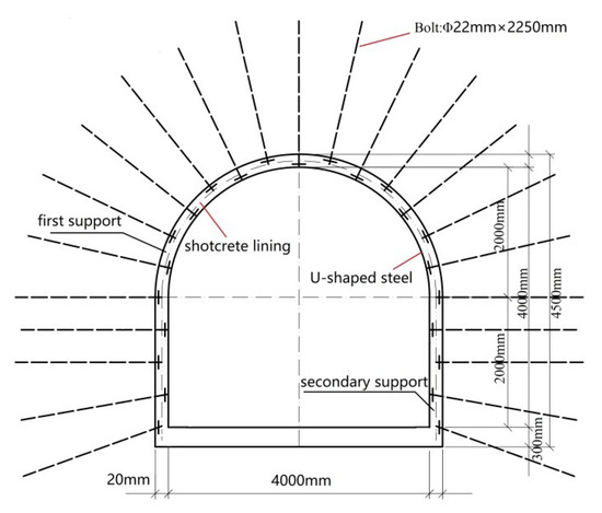 The test roadway adopts a semi-circular arched shape because of the reasonable stress distribution and high utilization rate. The primary support is a composite supporting scheme including a double-layer bolt-mesh-anchor and U-shaped steel, as shown in Figure 7. The anchor rod with cement mortar is made of secondary rebar and has a length of 2250 mm, a diameter of 22 mm and spacing of 1000 × 1000 mm. The anchor plate is made of an ordinary steel plate with a thickness of 10 mm and a size of 200 × 200 mm. Concrete with a compressive strength is 25 MPa is used for shotcrete lining, and the thickness of a single layer is 100 mm. The U-shaped steel support uses U36 steel, and the specific parameters of each support structure are shown in Table 3, Table 4 and Table 5 [40,41].