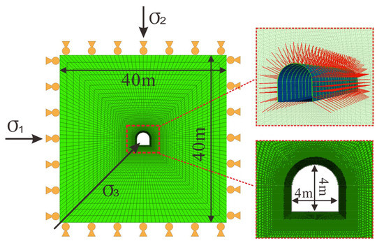 The numerical model, as shown in Figure 8, was established according to the actual standard size of the tentative roadway: the semicircle arch radius is 2 m, and the height of the straight wall is also 2 m. The dimensions of the entire model are 40 m in length, 20 m in width, and 40 m in height. The displacement boundary is set in six directions to control the normal displacement, and triaxial ground stresses are applied in the model. The primary support is simulated based on the structural units in the software: a beam unit for the U-shape steel, a cable unit for the anchor, and a Shell unit for the concrete spray layer. In this program, Equation (4) is an incremental distribution function between 0–1 and the value of the parameters only affects the shape of the curve, so the value is required to be within a reasonable range, namely, the value of λ is in the same order of magnitude as c, m and λ refers to the literature [27] and [42]. Thus, λ and m were selected to be 1 × e6 and 2 respectively, and m was taken as 5 in Equation (7). Six numerical simulations were carried out in this paper, using the MC, SS, and SSD models under no support and primary support, respectively.