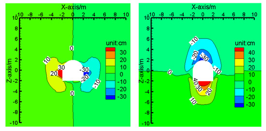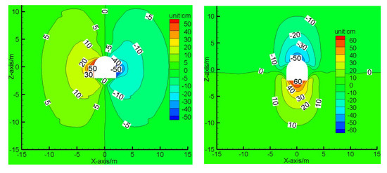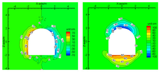 The results of the horizontal and vertical displacement of the surrounding rock mass under the unsupported condition calculated using the MC model, SS model, and SSD model are shown in Figure 9, Figure 10, Figure 11 and Figure 12.