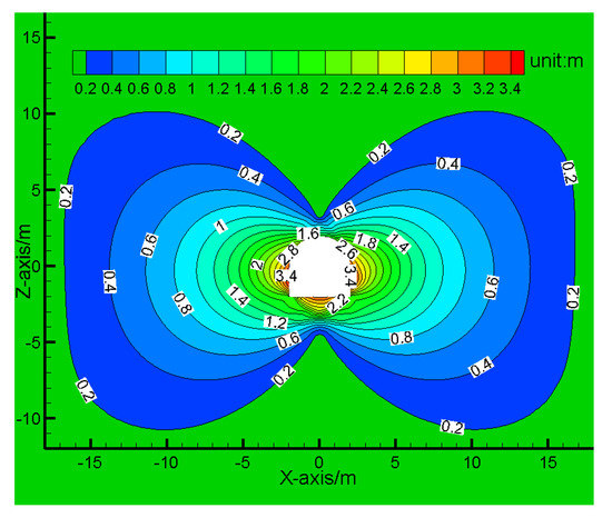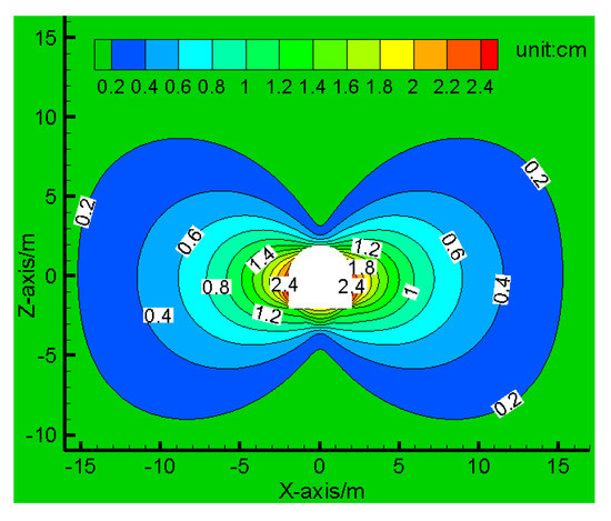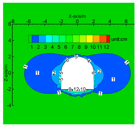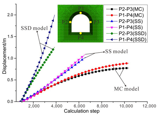 The computation results of the displacement of surrounding rock mass under the primary support based on the MC, SS, and SSD models were obtained and are shown in Figure 14, Figure 15 and Figure 16 in which the displacement is the result of the horizontal and vertical displacement.
