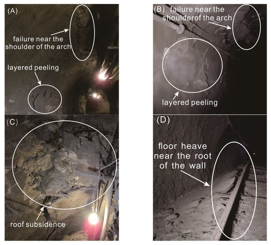 Deformation and failure of the roadway near the study area: (A,B), surface cracking and layered peeling; (C) roof subsidence; (D) floor heave.