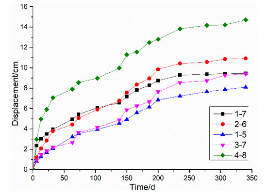 The average displacement curves of the monitoring points in the five sections are shown in Figure 19. I can be observed that the deformation process of the surrounding rock can be divided into three stages. Using 15 days and 200 days as the boundary points, the deformation experienced three stages: rapid growth, slow growth, and basic stability. At the last measurement, the maximum deformation occurred between points 4 and 8, which is the deformation of the top and bottom plates, and that was about 15 cm.