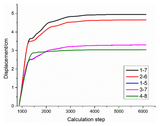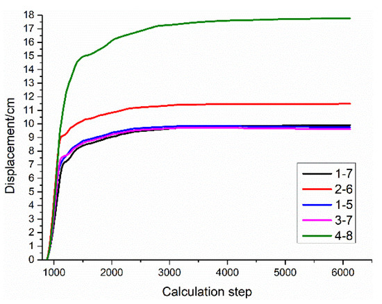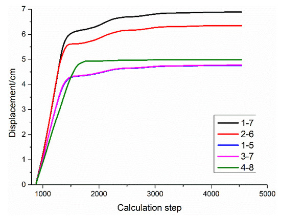 Then, the displacement values of each monitoring point were extracted from the computation results and plotted into curves, as shown in Figure 20, Figure 21 and Figure 22.