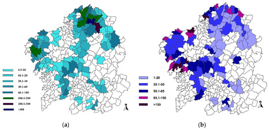 Territorial distribution of: (a) number of wind turbines (2018), and (b) population density (inhabitants per km2) in municipalities with wind farms in Galicia (2016). As can be seen, most municipalities with wind farms in their territories have low population densities, often below 50 inhabitants per square kilometre, which makes this new economic activity even more relevant for rural areas. Municipalities with more than 100 wind turbines have an average population density of 20.6 inhabitants per square kilometre, while the density of those with less than 10 wind turbines is 113.5 inhabitants per square kilometre. Source: Own elaboration from: (a) Socioeconomic Information Database of Wind Energy in Galicia (SIDWEG) [18]; (b) Instituto Galego de Estatística (IGE) [19].