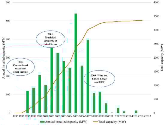 Figure 2 shows the temporal dynamics of the possibility of income flows for the municipalities during the period analysed. Thus, in 1997, with the installation of the first wind farms, conventional taxes started having a local economic impact. In 2001, the mechanism that allows developing small wind farms owned by the municipalities was established. The most recent regulatory change is connected to the creation of the wind power tax and the ECF in 2009. That was also the year in which the installed power levelled off; since then and until 2017, it has only increased by 3%. In 2017, the total revenue of municipalities with wind farms in their territories amounted to 17.8 million euros (Table 3). The most important category of local income was that of taxes (92.7%), followed by the municipal ownership of wind farms (7.0%). The category of other incomes was the less significant one (0.2%). In the following sections, each revenue category and subcategory will be analysed in detail. As shown in Figure 2, the rapid expansion of wind farms in Galicia has been favoured by the existence of incentives, which were mainly associated with feed-in tariff mechanisms [50]. However, this support model has greatly changed in the last few years. Thus, in 2013, the feed-in tariffs incentive system was eliminated, and new support mechanisms have been created since. On the one hand, there is an auction system in which the compensation-for-operation amounts are determined, and, on the other, there is a compensation-for-investment mechanism [51]. The halt in the expansion of wind farms observed since 2008 was not a consequence of the establishment of specific taxes such as the canon eólico, but rather of other factors mainly including legal uncertainty, elimination of the compensation schemes, and decline of the demand because of the crisis.