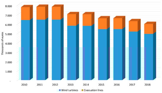 The IAE is another annual tax managed by the municipalities (19.6% of the total revenue in 2017). It is a levy on the wind power activity that imposes a rate per unit of power. Wind farms with a turnover of less than 1 million euros per year are exempt from this tax. The taxable base is linked to the net annual turnover, and the tax rate is around 1.5% [52]. Finally, the ICIO has also generated, within the wind industry, some legal disputes regarding the rates to be paid [53]. The debate revolved around whether the cost of wind turbines ought to be included in the taxable base of the ICIO or not. Various court sentences have been clear on the matter, and have included the cost in the taxable base. As a result, there has been an increase of income flow for the municipalities, given that wind turbines account for 70% of the cost of a wind farm [54]. The municipality establishes the ICIO rate, which ranges between 2–4% of the cost of executing the works, and is only paid once.