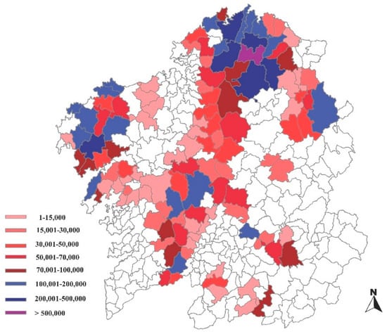In 2017, the direct ECF revenues earned by municipalities with wind farms were estimated at 6.3 million euros, representing 35.4% of the total municipal incomes derived from wind power activity. From a geographical perspective, the Galician municipalities that received greater amounts from this tax were the smaller ones, which are dispersed across the region’s territory (Figure 4). The economic impact of this tax on the municipalities located in the area of Serra do Xistral is worth highlighting, and among them, the case of Muras in particular, where 381 wind turbines are currently in operation. This municipality, which had a budget of about 1.7 million euros in 2016, has received, in the period during which the ECF has been active (2010–2018), more than 5.3 million euros in non-competitive subsidies for the number of wind turbines and evacuation lines located in its territory.