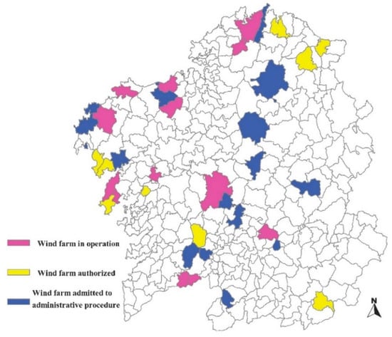 Galicia is a region situated in the northwest of Spain. The number of wind farms in the region has increased exponentially in the last few decades. In 20 years, around 4000 wind turbines have been installed in more than 150 wind farms across Galician rural areas. These wind farms have over 3300 MW distributed to 107 out of 315 municipalities in Galicia (Figure 1). In 2016, Galicia was, after Germany and Denmark, the third largest territory of the European Union in terms of wind power per unit area. On the other hand, it is important to point out that almost all of the wind turbines are located in rural municipalities with serious structural socioeconomic problems. To the low population density (98% of wind turbines are found in municipalities with less than 150 inhabitants per km2), it is possible to add the high ageing index (Galicia is the second autonomous region in Spain with the highest index) [14], the loss of agricultural employment (which has reduced by 65% in the last 15 years) and the increase in the number of abandoned towns and villages (from 1064 to 1726 in the 2000–2017 period) [15]. All of these factors have led to the progressive abandonment of cropland and forest areas [16], causing important environmental problems such as forest fires [17].