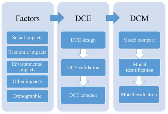 The developed framework needs to overcome three technical challenges to apply discrete choice theory to community acceptance of mining projects: (1) How to identify and verify the important factors (the mining project impacts and demographic factors) that may affect local community acceptance of a mining project; (2) How to design, validate and conduct effective discrete choice experiments that balance cost (number of respondents needed) and cognitive burden (whether the cognitive effort required to make the choices are reasonable); and (3) How to select the most appropriate DCM to describe the local community’s acceptance of mining projects. The methods proposed to overcome these three main technical challenges are discussed in the following sections.