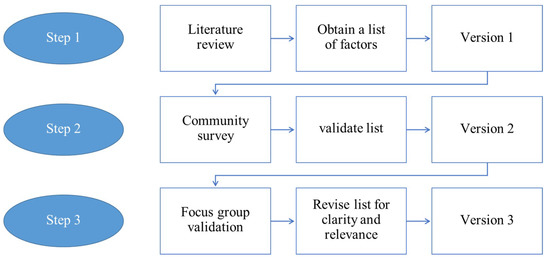 A three-step flowchart shown in Figure 2 can be used to identify important mining project factors and key demographic attributes. Step 1 begins with a review of the literature on sustainable development and its relationship to community engagement and then uses the literature to determine the dominant factors (version 1) that affect community perceptions of mining projects. In Step 2, community survey should be used to capture respondents’ perception of the level of importance of the identified factors in their decision to support a mining project. Statistical analysis needs to be used to analyze the survey data and determine valid mining impacts and demographic factors (version 2). In Step 3, discrete choice experiments need to be designed, involving all important mining project factors. A focus group study should be conducted to evaluate its intelligibility. Based on feedback from the focus group study, the list for clarity, effectiveness and validity were revised (version 3).