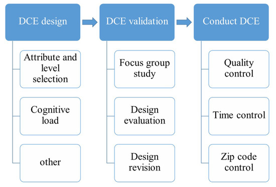 The DCE design includes attribute and level selection, cognitive load, and seven other design considerations and steps (i.e., stated preference vs. revealed preference, fractional factorial design, with or without interaction, experimental size, candidate design construction, efficient experiment design, duplicate check, and labeling) [26]. To address DCE validation, a focus group study is needed to capture respondents’ perception of the difficulty, clarity, reliability, and validity of the DCE. Statistical analysis should be used to evaluate the level of difficulty and clarity from the focus group results. Also, some revisions need to be done according to the answers of open-ended question. To conduct DCE and collect efficient data for the following DCM, the DCE needs to be conducted with quality control, time control, and zip code control. Quality control questions and minimum complete time should be set in the survey. The purpose of zip code control is to confirm the participants as part of a true local mining community by tracking their zip codes.