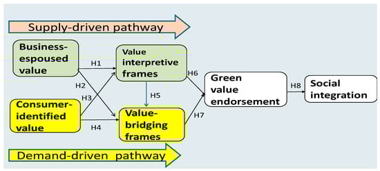 The traditional marketing literature emphasizes a single pathway of value endorsement process; that is, a business’ espoused value promotes green endorsement through value interpretive frames that lead to social integration, which are the main outcomes of marketing [20,25]. Therefore, green enterprises actively enhance the environmental value of enterprises and seek the value integration mechanism of value interpretive frames to create the green value endorsement of innovators and early users [16]. Given these developments, the authors argue that the prevailing tactics to investigate green value endorsement can be improved by a dual pathway method. This model has two pathways.