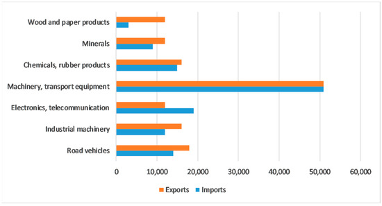 Swedish imports and exports in product groups (in million Swedish Kronas (SEK)—~100 k€) in 2017. Source: Own elaboration based on data from Statistics Sweden.
