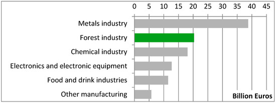 The forest industry is one of the most important business sectors in Sweden and plays a vital role in the country’s economy, accounting for 9–12% of the employment, exports, turnover and added value in Swedish industry [34]. As can be seen in Figure 2, the forest industry is the sixth-largest exporting sector in Sweden, following engineering products, electronic goods and the automotive industry. Note the large net export value in comparison with the automotive industry. The situation is quite the same for Finland, where forestry is the second-largest Finnish industry, accounting for 20.3 billion euros in 2016 (Figure 3).