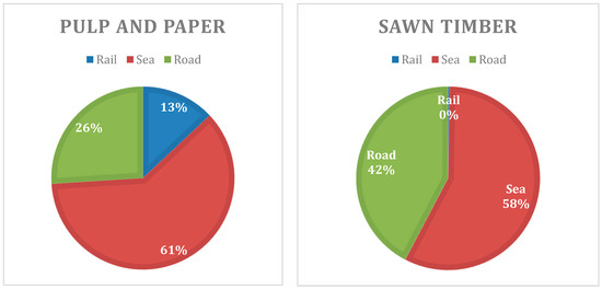 The forestry industry is the business sector that utilises Sweden’s railways the most, accounting for one-quarter of all rail freight transport [35], but shipping is employed for exporting the largest part of the Swedish forest products. As much as 61% of pulp and paper is exported by sea, while this percentage reaches 57% for sawn timber (Figure 4).