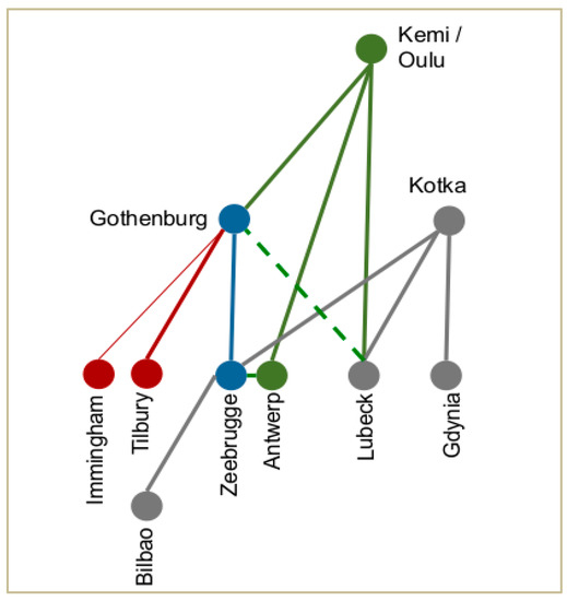 A major frequent service in Stora Enso’s SSS network is the connection between Gothenburg and Zeebrügge. According to Kisch, for trade between Gothenburg and Zeebrügge, Stora Enso charters a couple of vessels from Wagenborg shipping that make two round trips per week. These vessels are purposely built for Stora Enso’s cargo backed by a 15-year charter contract [41], with two levels of loading ramps, which reduces the vessels’ time at ports and allows them to run at 15 knots, compared to 18–19 knots, which is the sailing speed of their competitors. The forest industry is used to plan for the long duration of its assets, and the long charter time was not internally controversial due to strong volume growth at the time, but might not have been as well received in today’s business climate [41].