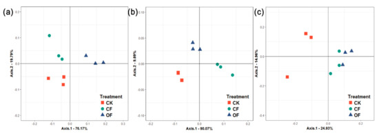 Unconstrained principal coordinates analysis (PCoA) illustrating the effect of fertilizers on the Euclidean distances of: (a) plant; (b) soil properties; and (c) the Bray–Curtis distance of rhizobacterial communities of pakchoi. CK, control; CF, chemical fertilizer; OF, organic fertilizer.