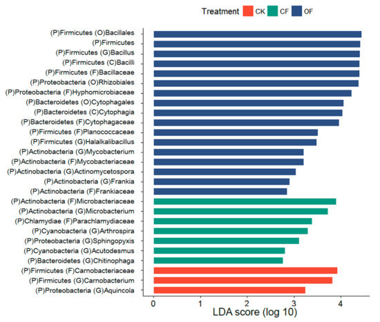 Given the clear separation of rhizobacterial communities between treatments, we then explored which specific microbial taxa were present and responsive in each treatment using LEfSe analysis (Figure 2). In the rhizosphere amended with organic fertilizer, we observed that the phylum Firmicutes was significantly higher than the other treatments, particularly for OTUs from the family Planococcaceae and the genera Bacillus and Halakalibacillus. In addition, OTUs from two families of Hyphomicrobiaceae (Proteobacteria) and Cytophagaceae (Bacteroidetes) and three genera belonged to the phyla Actinobacteria (Mycobacterium, Actinoycetospora, and Frankia) were enriched in OF. In contrast, the relative abundance of OTUs from the genera Microbacterium (Actinobacteria), Arthrospira (Proteobacteria), Sphingopyxis (Proteobacteria), Acutodesmus (Cyanobacteria), Chitinophaga (Bacteroidetes), and the family Parachlamydiaceae (Chlamydiae) exhibited significant increases with the addition of chemical fertilizer. OTUs from Carnobacterium (Firmicutes) and Aquincola (Proteobacteria) were responsible for the difference in the rhizosphere environment of CK.