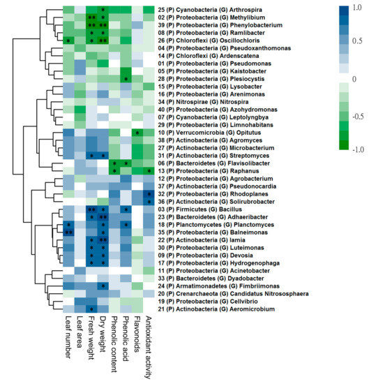 Spearman correlation between plant properties and the 40 most abundant genera in the rhizosphere presented by heatmap. The number in front of the bacteria represent the rank of relative abundance on average. Significance levels: *: p < 0.05; **: p < 0.01. (P), phylum; (G), genus.