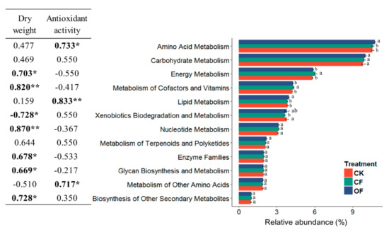 Predictive metabolic level 2 functions of rhizobacterial communities under different fertilizations. Bars with different letters are significantly different (p < 0.05, Duncan’s test). The table shows the Spearman correlation coefficients between the predictive functions and plant dry weight and antioxidant activity. Significance levels: *: p < 0.05; **: p < 0.01.