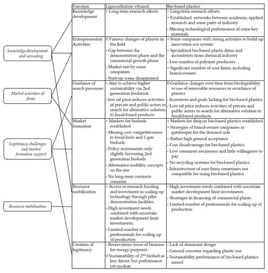 For all value chains, further advances in knowledge development is key prerequisite for further diffusion [48,56]. While there have been important advances in the past, without significant developments efficiency or performance is insufficient to achieve cost competitive to fossil-based products. Hence, the continuation of innovation funding is of key importance for all IB innovation systems. While established and emerging advanced life science technologies remain core competencies, significant progress may be expected from the integration with other technologies, such as environmentally benign chemical processes and with digital technologies and bioinformatics [57]. The specific technological challenges are partly similar and overlapping between the IS, to some degree specific challenges such as pre-treatment for lignocellulosic for ethanol exist. However, the limitations of R&D policy also have to be pointed out. First, R&D resources could not be identified as the key bottleneck in the various value chain. Second, in most of the value chains large multinational firms dominate the actor landscape, and R&D funding to increase activities in certain topics can only incentivize those firms to a limited to degree.