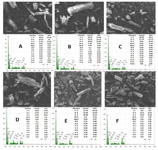 3.7. The EDX Spectra along with the Elemental Composition Spectra of the Raw Cow Manure and Cow Manure Effluents