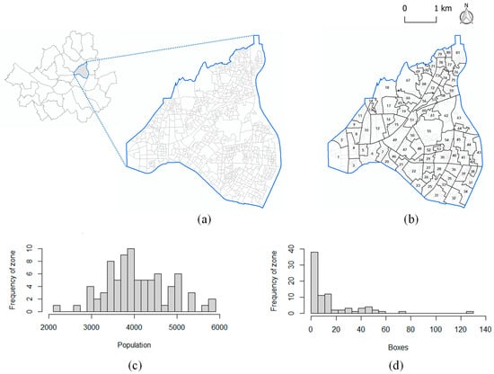 The present study uses pharmaceutical supplies as a case-study commodity primarily due to a data availability and the attributes of the commodity. We could acquire specific daily delivery schedules including all customer locations with cooperation of two existing logistics companies delivering the case-study area during the last quarter of 2014. Additionally, pharmaceutical supplies better represent other commodities that do not require additional equipment for distributions. This enables model transferability to be more accessible to other similar commodities. The population distribution and the daily demand of pharmaceutical supplies in each zone are shown in Figure 1c,d respectively.