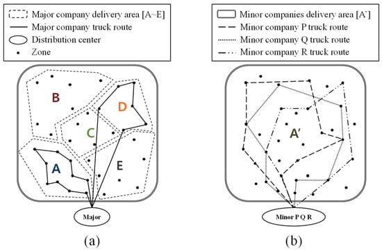 The different delivering strategies currently being employed by the major and minor logistics companies are illustrated in Figure 2. The small dots shown in Figure 2a,b represent the location of zones where multiple customers are located. Supposing that both the major and minor companies serve the same region, the major company considers regional allocation (see the dotted line in Figure 2a) in deliveries to optimize their delivery route, while the minor companies deliver the commodities without considering regional allocation (see the trucks routes in Figure 2b). The major company serves a large and stable quantity of commodities over a broad area. The dense demands for the major logistics company allow it to allocate a single truck to cover a smaller area compared with the minor companies. Since the demands for minor companies are sporadically scattered across the entire region, the minor companies are unable to consider regional allocation and their trucks must cover a wider area with less dense commodities. Note that the delivery pattern of the major company represents logistics behavior after collaboration and the minor company’s delivery pattern represents the logistics companies before joining the collaboration.