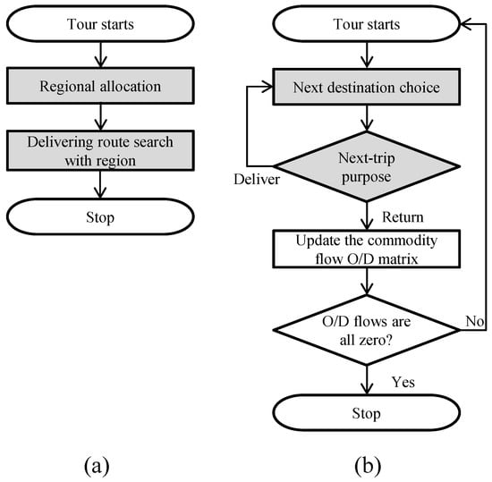 Two different truck routing models that consider the existing delivery strategies of the major and minor companies are developed. The truck movements of the major company are modeled in two steps: (i) regional allocation; and (ii) delivery route search (see the grey boxes in Figure 3a). On the other hand, the truck routing model of the minor companies do not consider regional allocation. The minor company model describes its truck route based on the available demand to deliver in the next destination and the trip distance from the current location to the next destination (see the grey box in Figure 3b). These two models are explained in Section 4.1 and Section 4.2.