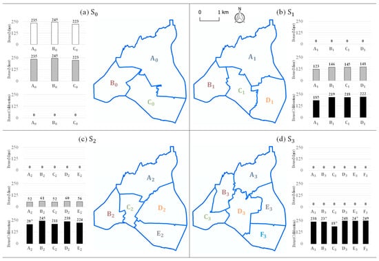 Table 1 shows the result of regional allocation in demand of each region under the different level share of collaboration. Currently, 703 boxes out of the 1406 comprising daily demand are delivered by the major company. Under the baseline scenario, , no collaboration, the case-study area is divided into three regions, , and (see Table 1 and Figure 4a). Each region under consists of 42, 14 and 25 zones, respectively. The amount of supplies being delivered by the major logistics companies (see the white bars in Figure 4) and the minor logistics companies (see the grey bars in Figure 5) in each region is shown in the left side of Figure 4a. Under Scenario 1, , in which 10% of the minor company joins the collaboration entity, the entity will deliver 185, 219, 218 and 222 boxes (see the black bars in Figure 4b) of supplies to region , , , and respectively. The boundaries of regions under different levels of collaboration are shown in Figure 4.