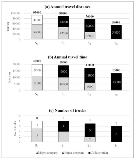 (a) annual travel distance; (b) annual travel time; (c) number of trucks for delivery under various levels of collaboration.
