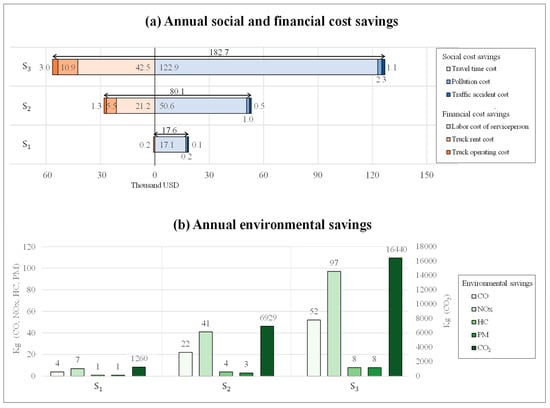Note that the social and financial savings (see Figure 6a) and the reduction in air pollutants (see Figure 6b) are estimated based on statistics from the case-study area. If the logistics collaboration was expanded across the entire municipality of Seoul (see Figure 1a), the impact of logistics collaboration can be expected to yield $3.9 M annually in social cost savings and $1.6 M in financial benefits.