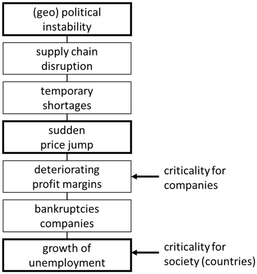 The cause–effect pathway of the socio-economic effects of resource scarcity is depicted in Figure 2. It starts with a (geo)political event (e.g., protectionism, social unrest in mining countries, strikes, etc.), which results in supply chain disruptions, or a sudden technical breakthrough. Because of limited stocks in the logistics chain, this will lead to shortages of the material(s). In the free market economy, that will result in higher prices, rising very rapidly, since all market players try to buy material stocks that are available. Companies which need the material will see risks to their profit margins because they cannot quickly increase the sale prices without losing market share. The weakest companies can go bankrupt, resulting in unemployment. That means that this phenomenon results in threats to society [41,42].