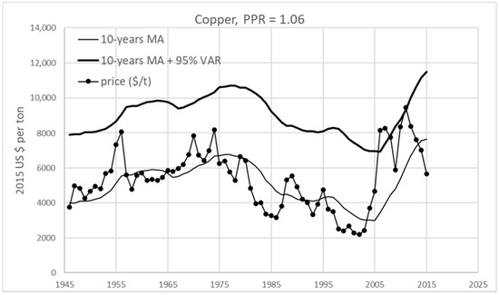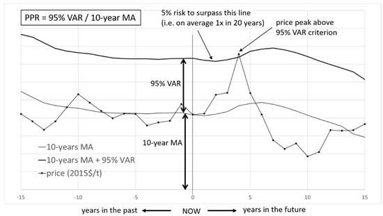 The issue here is to predict the risk of a price jump of a certain size in the relatively temporal period of 10 to 30 years. This can be done by statistics, since each metal is characterized by its own volatility in price as a result of its specific supply chain and its specific risks of geopolitical instabilities or quantum leaps in technical demand. Section 2.2 explains that the so-called value at risk at the 95% level on a yearly basis (95% VAR) is a good indicator for such a risk. The 95% VAR indicates the size of a price jump which is only surpassed in 5% of cases in a row of prices. Since prices are dynamic in the longer term as well, the 95% VAR is compared to the 10-year moving average (MA) price. We call this the price peak ratio (PPR; see Figure 3).