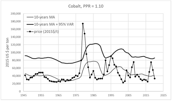 The price of cobalt in 2015 US$ per ton, the 10-year MA, and the MA + eco-costs, where the eco-costs = 95% VAR. Years with extreme price jumps are 1979, 1980, and 1995.