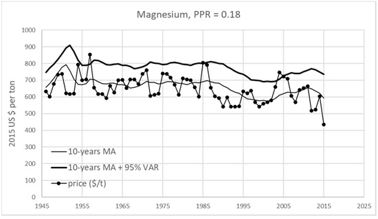 The price of magnesium in 2015 US$ per ton, the 10-year MA, and the MA + eco-costs, where the eco-costs = 95% VAR. Years with extreme price jumps are 1957, 1985, and 2004.
