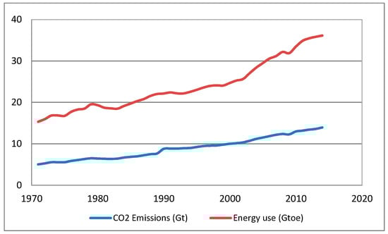 Decarbonization is needed, but it will be costly [19] and it should go along demand-side measures such as establishing caps for energy consumption [20]. However, despite the literature discussed above and the ongoing discussions in policy and academic forums, nowadays the world is not experiencing a process of decarbonization, as shown in Figure 1.