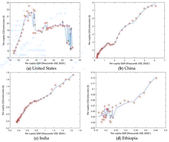 As an example, the results of the parameters estimated for the USA, China, India and Ethiopia are shown in Table 7. Figure 2a–d shows the regression graphs. The complete estimates are provided in Appendix A.