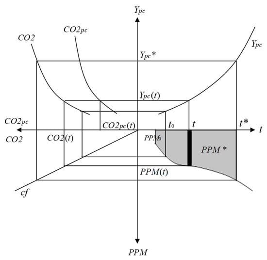 As time goes from onwards, income per capita increases, determining the per capita income locus. The econometric equation, represented graphically by the curve , establishes its value depending on the per capita income and energy efficiency (this latter variable is not shown in Figure 3). Multiplying this value by population, total CO2 is obtained ( locus). A percentage of the stream emissions are captured by the biosphere (soil, oceans and vegetation) and other, the residual, remains in the atmosphere (it is transformed into a stock). This lasting CO2 flow is expressed in ppm units by applying the corresponding conversion factor (cf locus). is the flow of CO2 retained in the atmosphere and accumulated year by year to the initial stock (PPM0)—the shaded area in the fourth quadrant of Figure 3. When the accumulated CO2 emissions reach the critical threshold determined as , that is when the shaded area is equal to , the critical period is reached. Then, the critical time is defined by:
