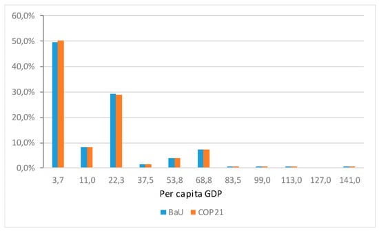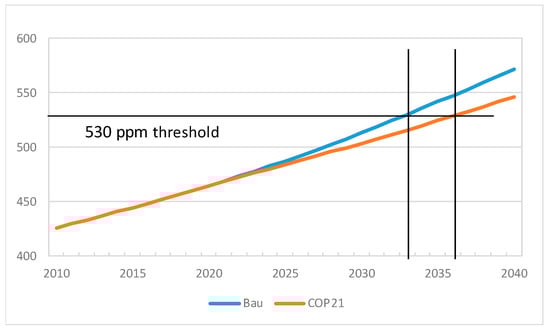 The critical period is reached when GHG concentration in the atmosphere reaches the threshold of 530 ppm (Figure 4). Under the assumptions of the BaU scenario, the critical time is that is, in 14 years from the current year 2019. For the scenario COP21, the critical period is extended only by three years, until . The main explanation for this limited difference between the scenarios is that the level of GHG accumulated in the atmosphere until 2014 (PPM0, Figure 3), as a consequence of CO2 emissions by the current high-income countries since the industrial revolution, is quite high (GHG = 441 ppm, equivalent to 83% of the threshold of 530 ppm). Therefore, the room for change is rather limited, an example that responsibilities are common but (very) differentiated.
