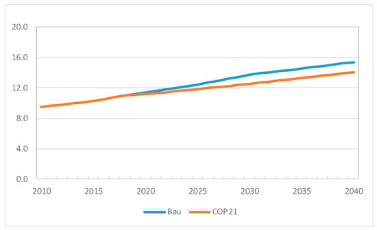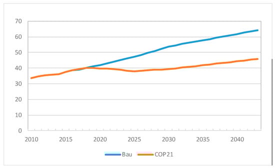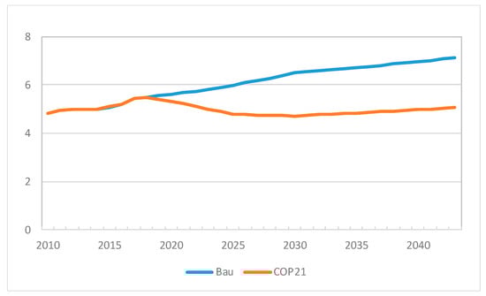 The main differences between these two scenarios are in energy and environmental indicators. The combined effort to reduce the rate of economic growth and increase the rate of growth of energy efficiency generates a significant reduction in global CO2 and per capita emissions (Figure 5 and Figure 6). In fact, in 2036, CO2 emissions per capita under the COP21 scenario are 27.8% lower than the per capita emissions of the BaU scenario, while total CO2 emissions are 27.3% lower.