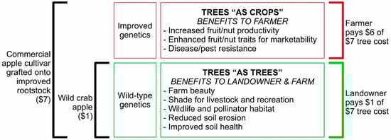 The lease at Vulcan Farm also included a provision to allocate the value of trees—both the cost at establishment and in case of lease termination—according to their value as trees and their value as crops (Figure 1). Although, to our knowledge, this represents a novel strategy to make agroforestry accessible to a beginning farmer in the USA, the partitioning of value and use rights of trees and forests is common in other parts of the world [37].