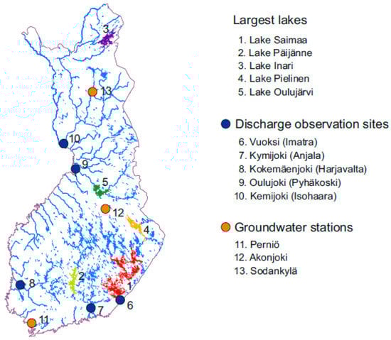 The major lakes and rivers in Finland. The location of the five largest lakes, the discharge observation sites used for comparison in this study, and the three groundwater stations analyzed are shown on the map.