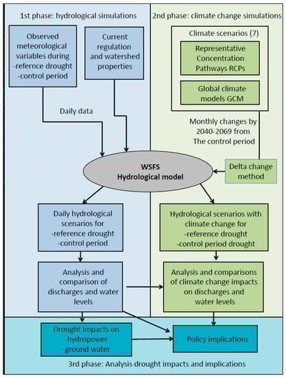 The drought impact analysis used in this study included three main phases. The study methodology can be seen in Figure 2. The first study phase included the hydrological modeling of the water levels and discharges during the reference drought in 1939–1942 (Section 2.6) and the control period 1981–2100, using the observed meteorological input variables (Section 2.4) and the hydrological Watershed Simulation and Forecasting System (WSFS) model (Section 2.5). The second phase includes an estimation of the impact of climate change on drought during the reference drought and during the control period using the delta change approach and seven climate scenarios (Section 2.7). In the third phase, the impact of drought on hydropower and the water supply from groundwater were analyzed (Section 2.8) and the policy implications discussed.