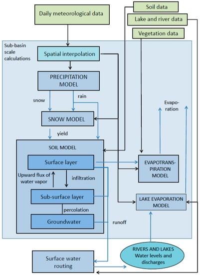 For the hydrological simulations, a new and more physically-based version of the WSFS hydrological model was applied (Figure 3). This version includes an energy-balance-based snow model, a rainfall–runoff model with a two-layer soil moisture model and lower groundwater storage and evapotranspiration and lake evaporation models. Other sub-models in the WSFS include a precipitation model and models for lake and river routing (Figure 3).