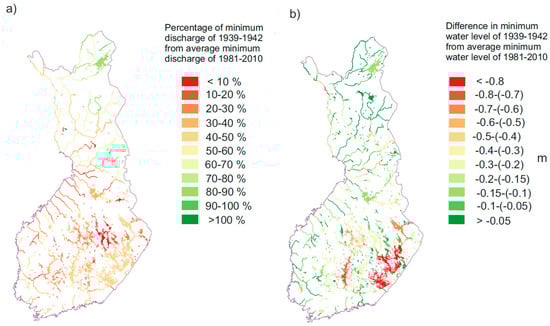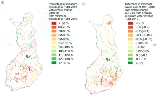 Minimum (a) discharge (%) and (b) water level (m) in Finland under the reference drought conditions compared to the average annual minimum of the control period 1981–2010.