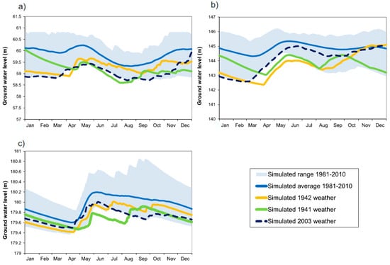 Simulated groundwater tables for 1981–2010 and during the reference drought with weather conditions from 1941 and 1942 at selected groundwater stations: (a) Perniö (South-Western Finland), (b) Akonjoki (Central Finland), (c) Sodankylä (Northern Finland).