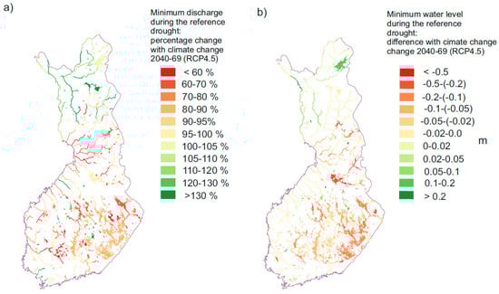 The minimum discharges during the reference drought also mainly decreased with the climate scenarios for 2040–2069 (Table 3, Figure 7a). On average in Southern and Central Finland, the projected range of decreases in the minimum discharge was between 8 and 16%, while in Northern Finland the changes range from a 3% increase to a 17% decrease (Table 3). For different rivers and lake outlets, the decreases were mostly between 5 and 40% with the average RCP 4.5 scenario (Figure 7a). In addition, the water levels mainly decreased, with modest 5–20 cm decreases on most lakes and rivers (Figure 7b). In places where climate change increased the discharge and water levels, the timing of the minimum discharge and water level was mostly during winter, due to either the northerly location or lake regulation. The increase is caused by the increased melting of snow during winter due to increased temperatures.