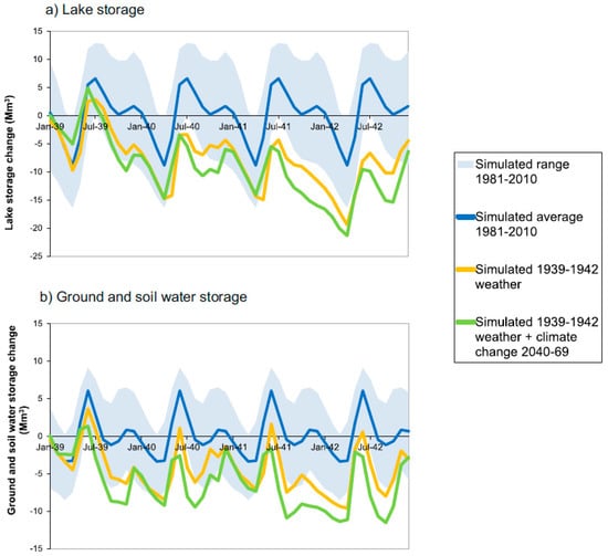 Figure 8 shows the modeled development of the total lake storage (for lakes over 1 km2) and soil and groundwater storage for Finland during the reference drought (conditions of 1939–1942) compared to the period 1981–2010. For one and a half years, the storage levels of the reference drought were lower than the minimum values for the summer of the third year of drought in 1981–2010 (corresponding summer 1941). Climate change (the average RCP 4.5 scenario) will further decrease the storage levels during the latter part of the reference drought.