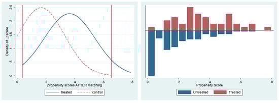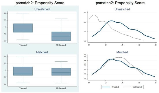 After the matching procedure, all the 41 users were paired with 41 non-users out of 159. Following Leuven and Sianesi [52], we conducted t-tests before and after matching to gauge whether the means of observed characteristics between the two groups were equal. While the differences in the unmatched sample are significant, the balancing property of covariates is satisfied after matching as the means between users and non-users is insignificant. According to Caliendo and Kopeinig [53], a good match is achieved when covariate means for the control and treated groups are equal. Also, Rosenbaum and Rubin [41] recommend checking t-test for insignificant differences because if the covariates used in the match are randomly distributed, the significance level should be insignificant. Regarding visuals, Figure 2 and Figure 3 shows the achieved region of common support due to the satisfactory balancing of characteristics between users and non-users.